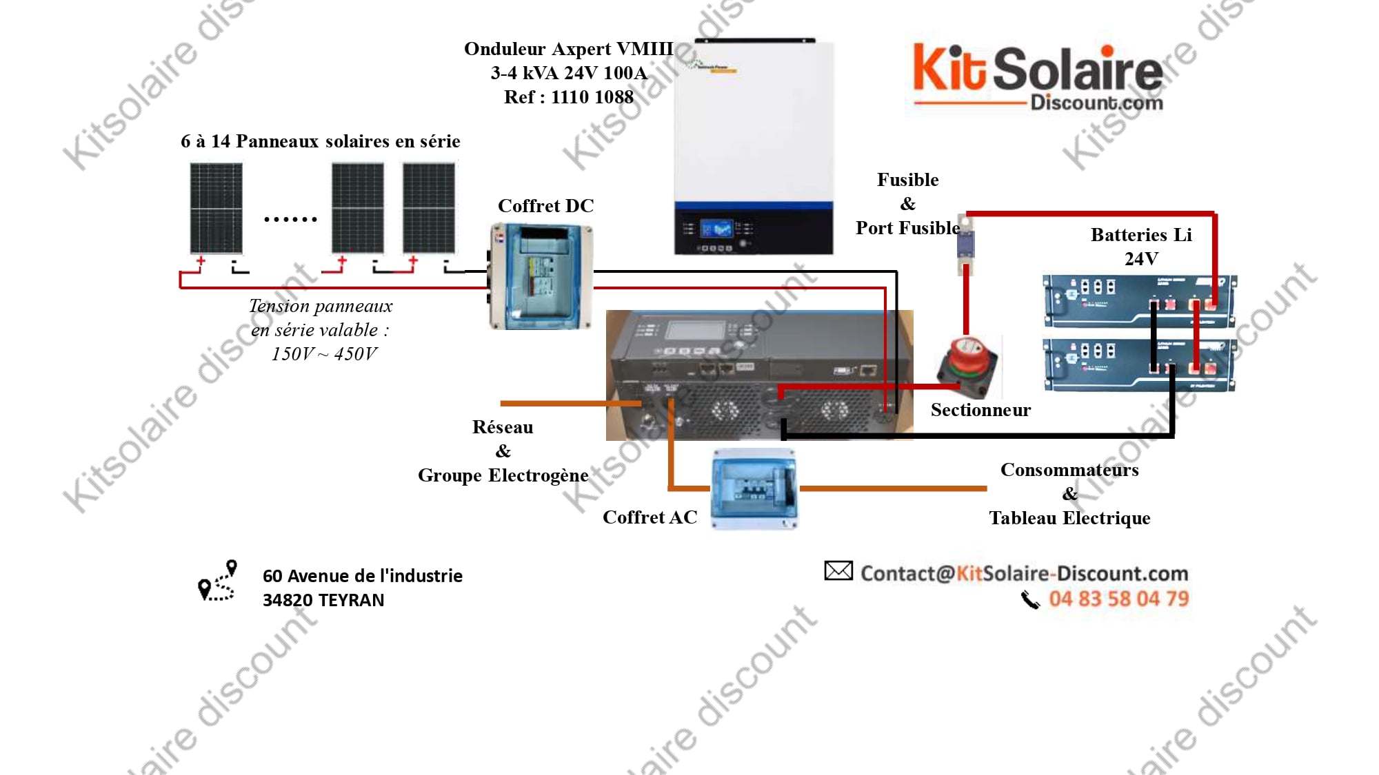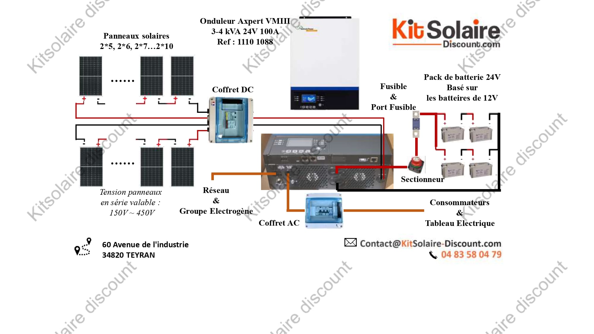 Découvrez ici 4 schémas de câblage détaillés pour une installation solaire autonome utilisant l’onduleur hybride Axpert VM III 3-4kW (24V) un parc de batteries 24V.