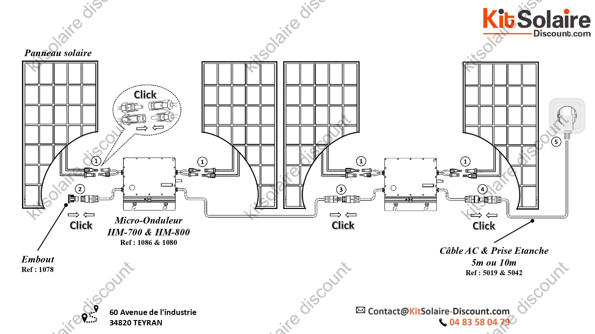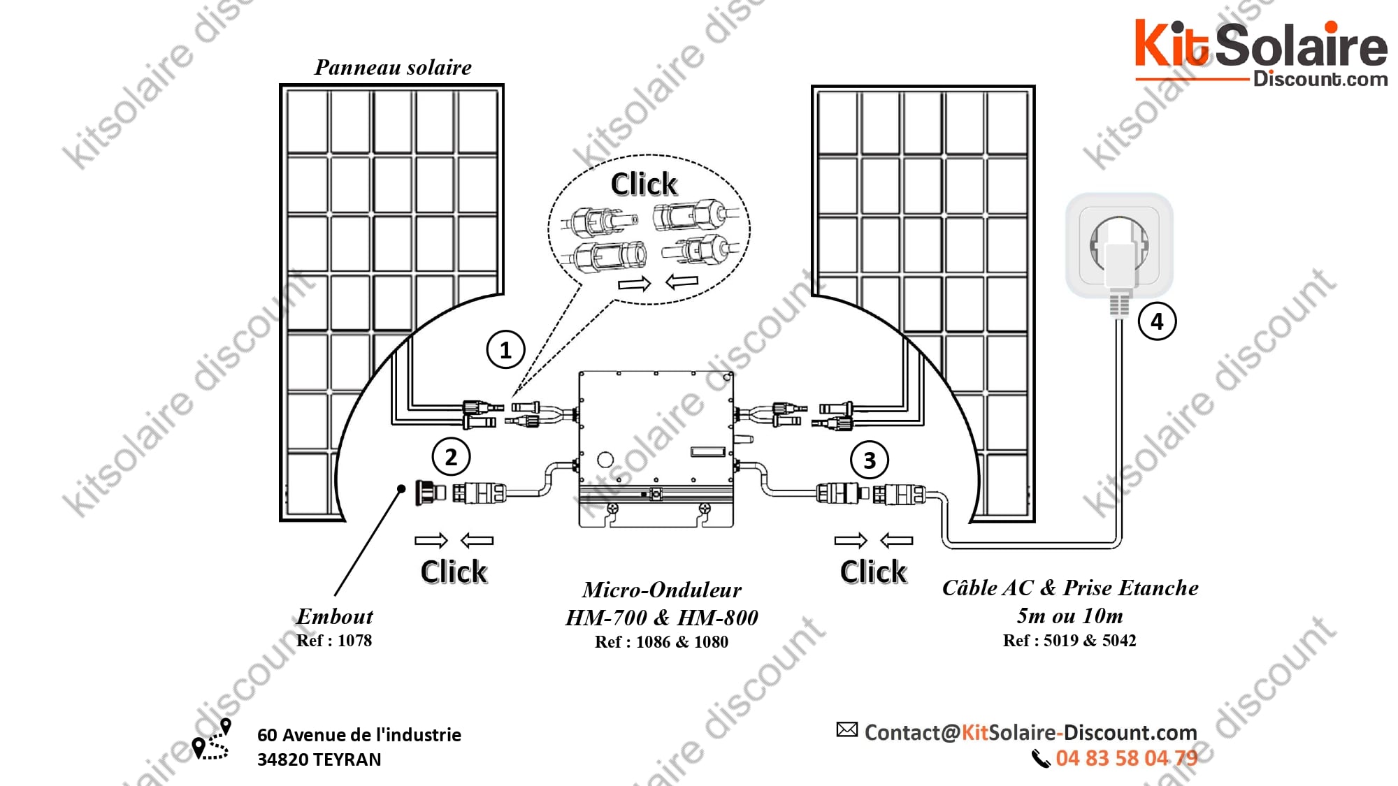 Ce schéma présente le branchement du kit solaire Plug & Play 2 à 4 panneaux utilisant le micro-onduleur Hoymiles HM-800 (Réf. 1080). Cette solution est idéale pour les particuliers souhaitant produire leur propre électricité en toute simplicité, sans faire appel à un électricien.