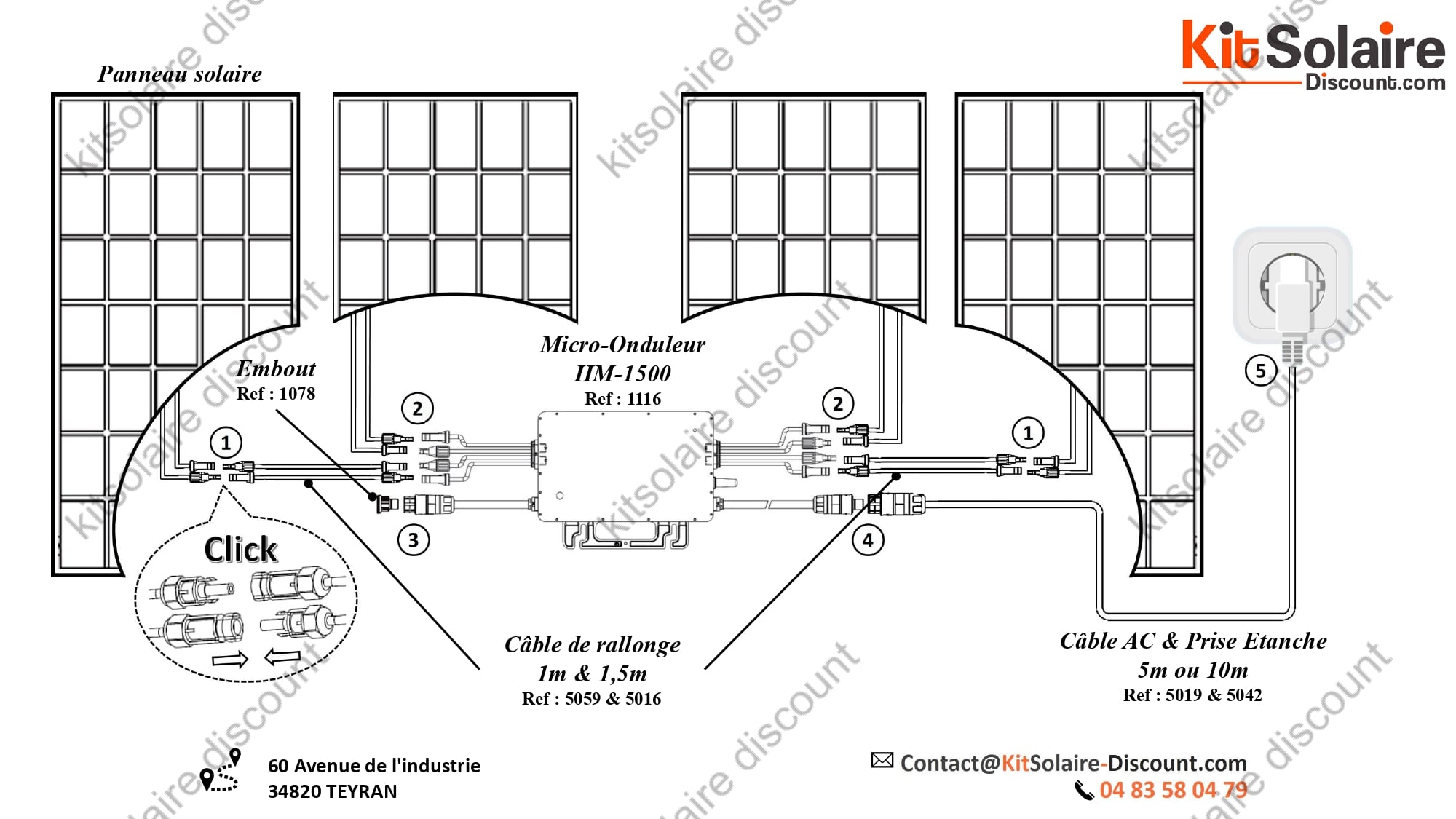 3. Câbles de rallonge : 3m, 5m ou 10m (Réf : 5054, 5057, 5014) : Permettent de relier les panneaux à l’onduleur en fonction de l’agencement souhaité